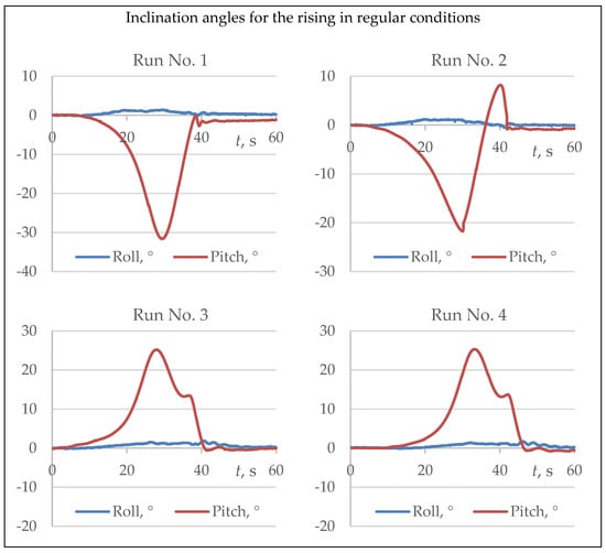 The roll was below 6.2° for all the conducted tests, without significant oscillations; see Figure 17 and Table 13. However, the oscillations were more pronounced than in the previous ascending tests, probably due to excess weight on the starboard side. The maximum value of the pitch was considerably high, and the corresponding rate was also significant, except for Run No. 4, which was conducted under higher pressure. As a result, the surfacing time was shorter and the pitch angle was also smaller.