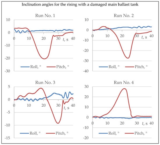 The inclination angles for the rising with a damaged variable ballast tank (time axes at model scale).