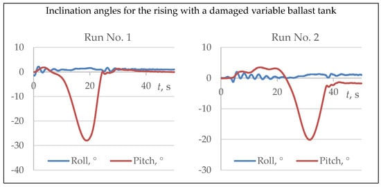 In general, the pitch angle decreases as the rising process evolves. Eventually, at the surface, the value settles approximately at 5° due to the aft trim caused by the flooded starboard battery. Since the excess mass of water that flooded the battery pod was larger than the mass of the drop weight, after surfacing and after the blowing was stopped, the submarine started to sink again with a significant aft trim.