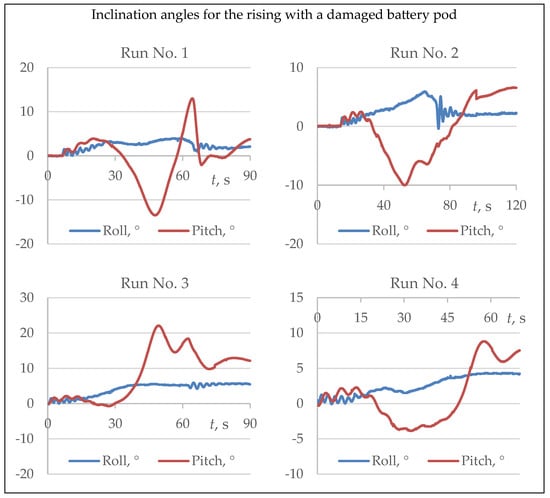 The inclination angles for the rising with a damaged battery pod (time axes at model scale).