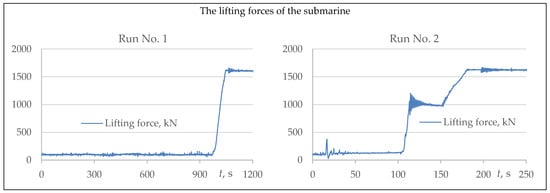 The lifting test was carried out with two values of the lifting velocity. The velocities were 0.07 and 0.42 m/s at full scale for Runs No. 1 and 2, respectively. The corresponding lifting times were 10.7 and 1.8 min (at full scale). The second run was significantly faster; consequently, one jump in the lifting force was observed, as seen in Figure 18. In the figure, the presented values are at full scale. In general, during the lifting, there were no significant sudden changes or oscillations in the lifting force for either of the lifting velocities.