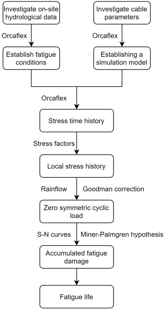 This paper employs a time-domain analysis method to analyze the fatigue characteristics of dynamic cables. This method takes into account the effects of multiple cyclic loads that dynamic cables experience in actual operational conditions, enhancing the accuracy of the predictive results. It can also be used to assess the fatigue performance of dynamic cables under complex conditions, such as predicting fatigue life under random load conditions. The basic process of time-domain fatigue analysis is illustrated in Figure 1.