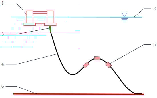 Arrangement of the dynamic cable configuration. 1. Floating platform, 2. sea surface, 3. bend stiffener, 4. dynamic cable, 5. float, 6. seabed.