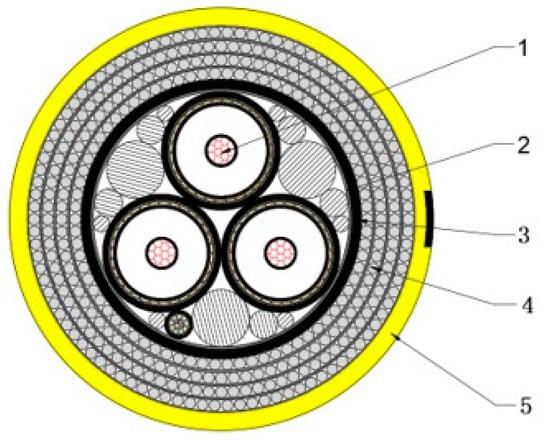 The three-core dynamic cable studied in this paper adopts a four-layer armor design. The cross-sectional structure of the cable is shown in Figure 4, and the cable cross-sectional parameters are presented in Table 6.