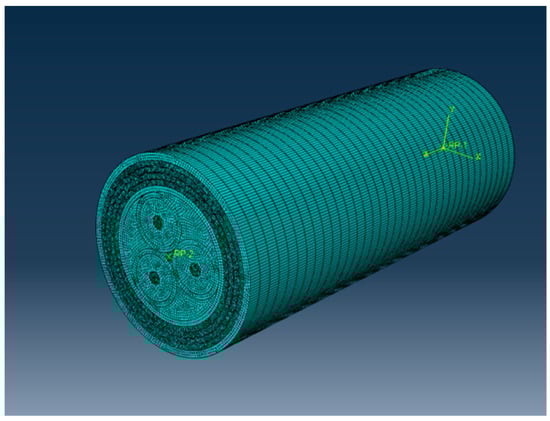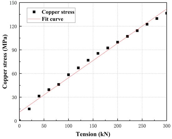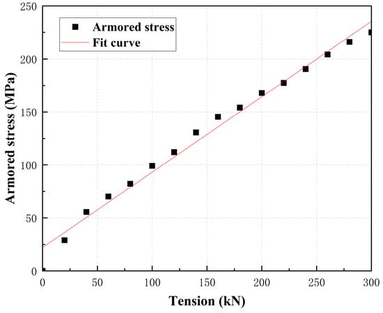 A finite element local model is established for the dynamic cable to ensure numerical calculation accuracy. The entire model adopts C3D8R elements, which are reduced-integration solid elements. This type of element enhances calculation accuracy while ensuring computational efficiency. The mesh division of the finite element model is shown in Figure 5. During the stretching, bending, and twisting processes of the cable, deformation occurs in each layer, leading to phenomena such as penetration between layers in contact. This can result in a decrease in the accuracy of the calculated results. To prevent these issues, contact between layers needs to be defined. A general contact is applied to the entire model, with normal contact being rigid and tangential contact being free sliding, neglecting the influence of friction. Two reference points are established at both ends of the finite element model, coupled with the corresponding nodes on the cross-section endpoints. The coupling is achieved through continuous distribution coupling at the coupling nodes, where boundary conditions for the finite element model are set. At one end of the model, full constraints are applied to the displacements in all three directions and the rotations in three directions. Additionally, tension loads are applied in the Z-direction at different levels. The stress magnitudes of the armored steel wires and copper conductors under different tensions are obtained. Scatter plots are created based on the tension–stress relationship, and fitting curves are generated, as shown in Figure 6 and Figure 7.