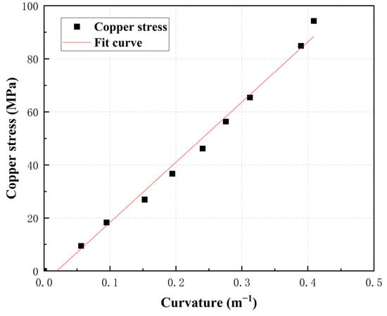 Different moments were applied to the dynamic cable to obtain the stress levels in armoring steel wires and copper conductors under various curvatures. Scatter plots were generated based on the curvature–stress relationship, and fitting curves were derived, as shown in Figure 8 and Figure 9.