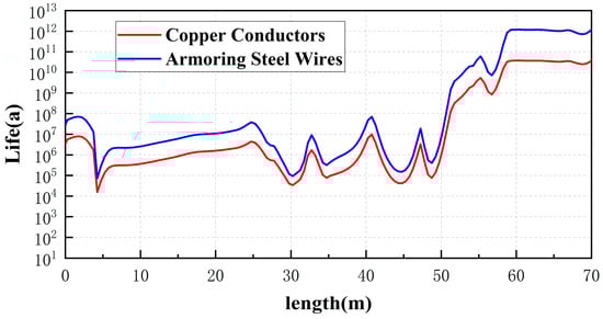 In accordance with the DNV-RP-C203 Fatigue Design of Offshore Steel Structures [] standard, the values of the empirical constants log(a) and m for the S-N curves of armoring steel wires and copper conductors are provided in Table 7.