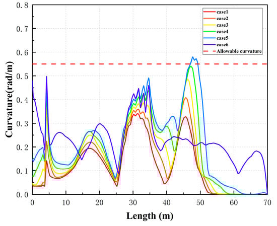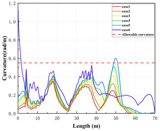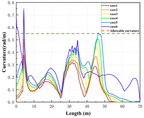 - Method I: Drawing inspiration from similar measures used in flexible cables [], add weight blocks to the section of the dynamic cable exiting the bend stiffener (as shown in Figure 14). The parameters of the weight block are listed in Table 9. The results, depicted in Figure 15, reveal a significant reduction in the curvature of the submarine cable at the exit of the bend stiffener compared to Figure 11. However, under Condition 6, the curvature at the root of the bend stiffener exceeds the allowable limit. The literature [] suggests that this occurrence may be due to insufficient strength of the bend stiffener. It can be inferred that the addition of the weight block increases the load on the dynamic cable, causing the bend stiffener to lack the necessary strength. To ensure that the curvature of the entire cable is within the allowable range under this condition, further adjustments to the parameters of the weight block are required. Under Condition 5, the curvature in the arched area behind the dynamic cable’s float block exceeds the allowable limit. When no weight block is added, the curvature in this area is close to the allowable limit. This indicates that adding the weight block has some influence on the curvature in this area. However, the main factor causing excessive curvature in this area is the float block.