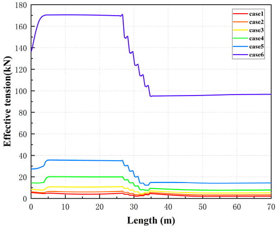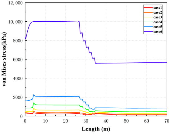 In the same wave height conditions, the cable curvature is maximum under the north-direction waves. This is mainly because the static cable in this study is arranged in the north–south direction. The cable is laid in the sea area with a wave height range of 0–6 m throughout the year. When the wave height is greater than 2 m, the maximum curvature of the cable occurs at the exit of the bend stiffener. Therefore, starting from a wave height of 2 m, with a 1 m interval for wave height values and a wave direction of north, five typical working conditions are defined, namely, Condition 1 to Condition 5. Condition 6 represents an extreme condition that occurs once in a hundred years. Although the frequency of its occurrence is very low, the cable must meet the requirements of extreme conditions. The characteristic parameters of these six typical conditions are shown in Table 8. Fatigue analysis is conducted for the dynamic cable under these conditions, and the curvature, effective tension, and von Mises stress distributions along the cable length are calculated and presented in Figure 11, Figure 12 and Figure 13, respectively. It can be observed that under the six conditions, the effective tension and von Mises stress of the dynamic cable all satisfy the allowable conditions. However, under Conditions 3 to 6, the curvature of the dynamic cable exceeds the allowable curvature at the bend stiffener exit (4.25 m).