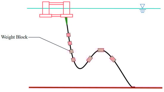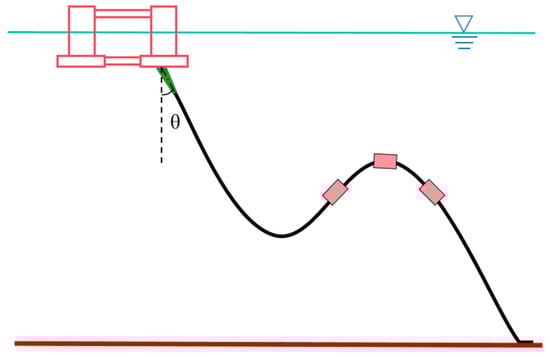 Based on a Science and Technology Project of POWERCHINA Hainan Electric Power Engineering Co. Ltd. (Haikou, China), a fatigue analysis was conducted on dynamic cables of the 26/35 kV voltage level. A numerical simulation model of the dynamic cable was established, including the floating platform and dynamic cable. The top end of the dynamic cable was connected to the floating platform with bend stiffeners added at the connection point. The bottom end of the dynamic cable was connected to the static seabed cable laid on the seafloor. The linear shape of the dynamic cable was set as a catenary, and its working water depth was specified as 25 m. To ensure computational accuracy, the grids for the bend stiffener section and float section of the dynamic cable were refined, and the grid accuracy of the section was 0.5 m. The floats are arranged at intervals of 1.5 m from 27 m to 34.5 m of dynamic cable, with a mass of 0.1 t and a volume of 0.23 m3. The velocity of the flow is in the same direction as the direction of the wave []. The hanging angle is 5°. The arrangement of the dynamic cable is illustrated in Figure 2.