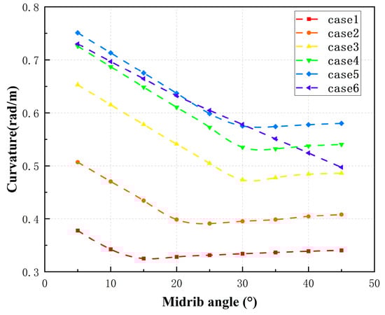 Curvature distribution along the cable length with the hanging angle of 45°.