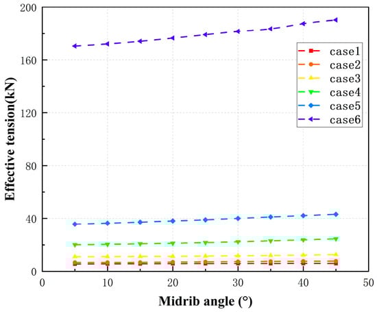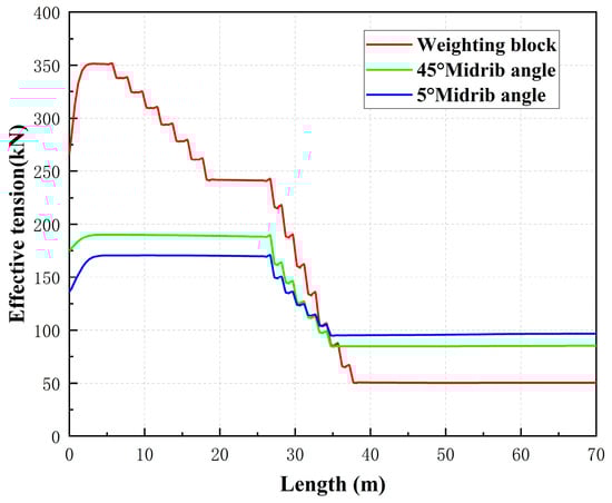 Compared to the two methods mentioned above, both approaches can ensure that the dynamic cable curvature at the out-of-bend section meets the allowable curvature under different working conditions. In practical engineering, the gravity block is located underwater, making it difficult to adjust according to working conditions. Additionally, adding a gravity block increases the maximum effective tension and von Mises stress of the dynamic cable, which is detrimental to the cable’s lifespan and imposes additional loads on the connection components between the cable and the platform. On the other hand, adjusting the hanging angle can be achieved by designing a bend stiffener with an automatically adjustable angle. This device is smaller and closer to the sea surface, making it more convenient to operate. Furthermore, adjusting the hanging angle does not introduce additional stress loads on the cable, making it more suitable for practical engineering applications.