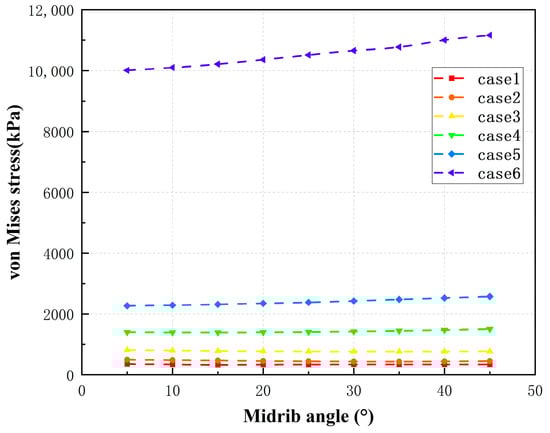 - Method II: Changing the hanging angle of the dynamic cable’s bend stiffener (as shown in Figure 16), studying the influence of the bend stiffener hanging angle on the maximum curvature, effective tension, and von Mises stress of the dynamic cable under different conditions. Figure 17 shows the distribution of the maximum curvature along the length of the dynamic cable with a hanging angle of 45°. Compared with Figure 11, the curvature of the cable at the bend stiffener outlet is significantly reduced. Therefore, adjusting the hanging angle can effectively reduce the cable curvature. By varying the hanging angle, further research on its impact on the dynamic cable’s maximum curvature, effective tension, and von Mises stress is conducted, and the results are shown in Figure 18, Figure 19 and Figure 20. As the hanging angle of the dynamic cable’s bend stiffener increases, the curvature at the bend stiffener outlet gradually decreases under Condition 6, and at 40°, it is lower than the allowable curvature, and in this condition, the dynamic cable’s maximum curvature always occurs at the bend stiffener outlet. For Conditions 1 to 5, the curvature at the bend stiffener outlet decreases with the increase in the hanging angle. In working Conditions 1 to 5, when the hanging angle is adjusted to 15°, 20°, 30°, 30°, and 30°, the curvature of the dynamic cable bending preventer is reduced to lower than the curvature of the rest of the dynamic cable, respectively; the maximum curvature of the dynamic cable shifts from the exit of the bend stiffener to the midpoint of the arch behind the buoyancy block. Therefore, there is a maximum value for adjusting the overall maximum curvature of the cable with the hanging angle. Beyond this value, the dynamic cable’s maximum curvature shifts from the bend stiffener outlet to the midpoint of the arch after the floating block area, and the effect of adjusting the hanging angle disappears. With the increase in the hanging angle, the maximum effective tension and maximum von Mises stress for each condition gradually increase, but the increase is relatively slow. As indicated in Figure 19 and Figure 20, with the increase in the hanging angle, the maximum effective tension (i.e., the maximum pulling force experienced by the cable during operation) and the maximum von Mises stress of the dynamic cable gradually increase for each working condition, but the magnitude of the increase is relatively moderate. Therefore, applying a certain hanging angle to the dynamic cable can ensure that the cable curvature at the bend stiffener outlet meets the allowable requirements. However, the hanging angle of the bend stiffener should not be too large to avoid ineffective adjustment and unnecessary increases in cable tension and stress.