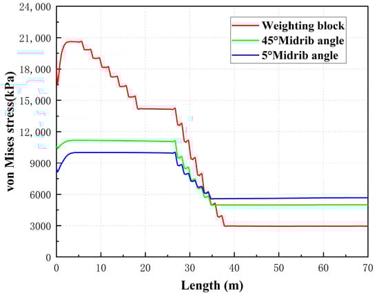 In comparison between using the method of adding a weight block (Method I) and adjusting the hanging angle to 45° (Method II), the effective tension and von Mises stress of the dynamic cable are shown in Figure 21 and Figure 22. Both methods increase the effective tension and von Mises stress of the dynamic cable from the bend stiffener to the floating block section. However, Method II generates maximum effective tension and maximum von Mises stress that are 45.87% and 45.86% lower, respectively, than those produced by Method I. Therefore, adopting Method II can reduce the stress and tension of the dynamic cable, which is beneficial for extending the cable’s lifespan. It can also be observed that when the hanging angle changes, such as from 5 degrees to 45 degrees, the effective tension and von Mises stress of the dynamic cable from the bend stiffener to the floating block section increase, but the magnitude is limited. Therefore, adjusting the hanging angle to reduce curvature while having a minimal impact on effective tension and von Mises stress is feasible for different conditions.