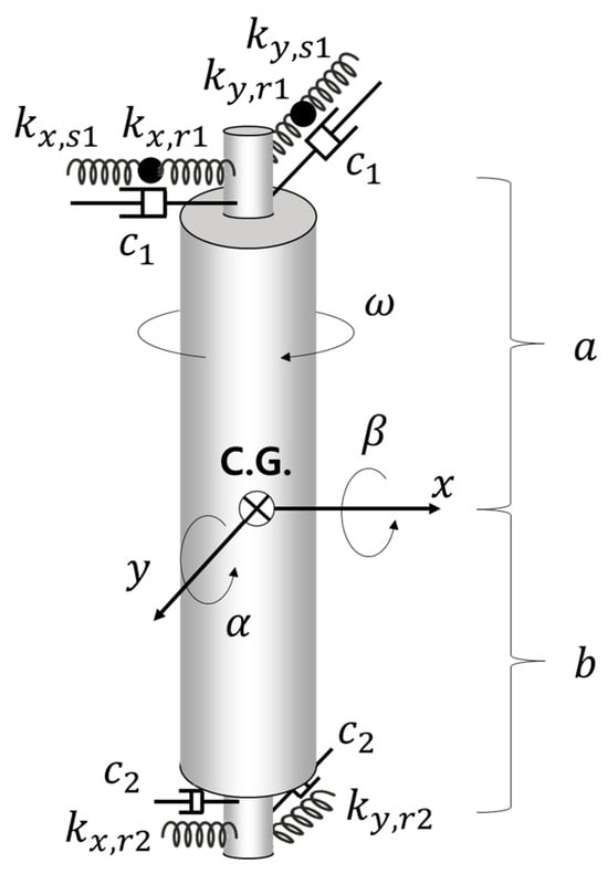 In the 4DOF model, it is assumed that the rigid rotor has a concentrated mass at its mass center. The rotor’s dynamic characteristics are analyzed by defining support points at both ends. In the case of the rotor sail described earlier, there are a total of three support points: two bearings in the upper support and one bearing in the lower support. The upper support consists of one roller bearing with support stiffness () and one thrust bearing with support stiffness (). The lower support has a support stiffness () due to a single roller bearing.