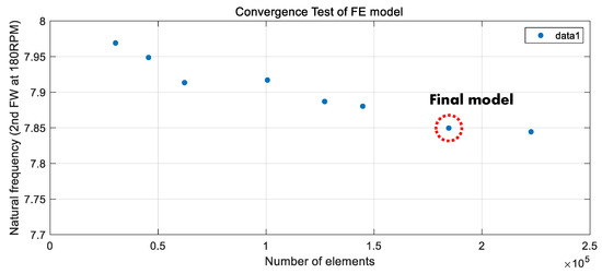 In the modal analysis, the natural frequencies were computed for a total of seven rotational speeds (0 RPM, 30 RPM, 60 RPM, 90 RPM, 120 RPM, 150 RPM, 180 RPM). For the harmonic response analysis considering imbalance, rotating forces were applied as imbalance conditions at the positions of the Thom disk and the mid-plate. With various magnitudes and phases of the imbalance, force analyses were repeatedly conducted. To validate the reliability of the finite element model, a convergence test was conducted by varying the number of elements. As shown in