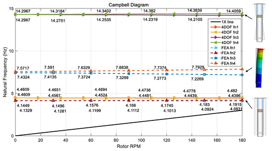 The 4DOF model can estimate low-order four natural frequencies including two forward whirl natural frequencies;