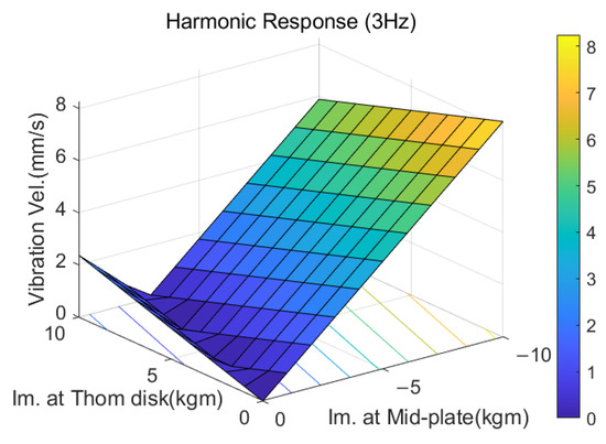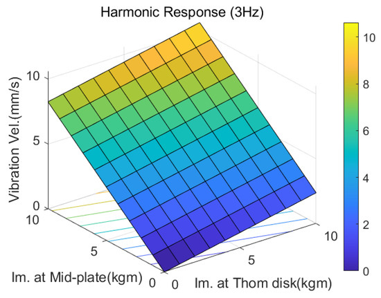 Figure 16. The mass imbalances in the Thom disk and mid-plate are depicted in an out-of-phase condition, and the vibration velocity is plotted. The maximum vibration velocity occurs when the mass imbalance is concentrated in the mid-plate.
