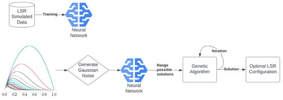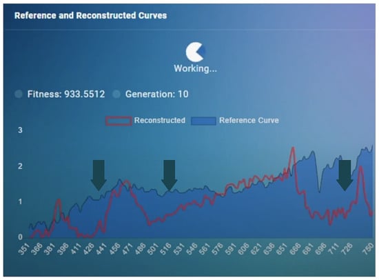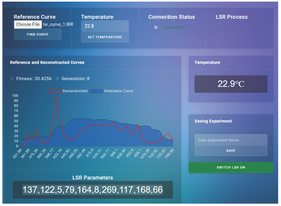 The output of the model represented a wide solution space for the LSR configuration. The solution space was then fed into the genetic algorithm in an iterative fashion to find the optimal solution (Figure 2, Figure 3 and Figure 4). The genetic algorithm used the MSE as a fitness function and found the optimal curve within 10 min. It is important to note that the LSR was not equipped with LEDs covering the 426 nm, 516 nm, and 726 nm light-spectrum areas, which, however, resulted in satisfactory performance (Figure 3).