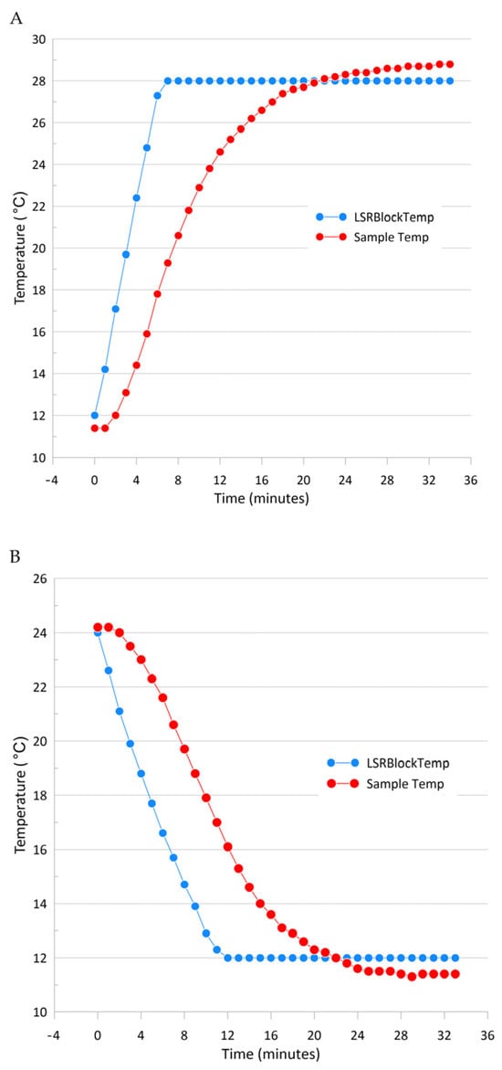 Stabilization of the temperature of the LSR block and in the sample during cooling (A) and heating (B) sequences. The figures were prepared in Grapher 22.1.333 (64-bit).