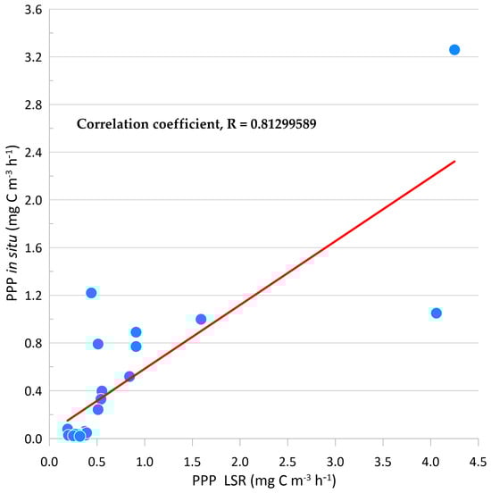 We compared the LSR and in situ particulate primary productivity (PPP) measurements from both locations (Kaštela and Stončica, Vis). For comparison, we used transparent and dark-bottle values from in situ moored incubations and the highest and dark values from the LSR (simulated in situ incubations) (Supplementary Materials). Comparison of the datasets showed a significant linear correlation (r = 0.81, p < 0.001) (Figure 8).