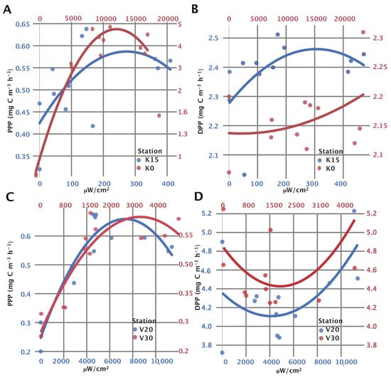 Examples of photoinhibition as measured in simulated in situ conditions (LSR) in terms of particulate primary productivity (PPP) and dissolved primary productivity (DPP). (A) PPP measurements taken at Kaštela Bay at 0 and 15 m; (B) DPP measurements taken at Kaštela Bay at 0 and 15 m; (C) PPP measurements taken at Stončica, Vis, at 20 and 30 m; and (D) DPP measurements taken at Stončica, Vis, at 20 and 30 m. Prepared using Grapher 22.1.333 (64-bit).
