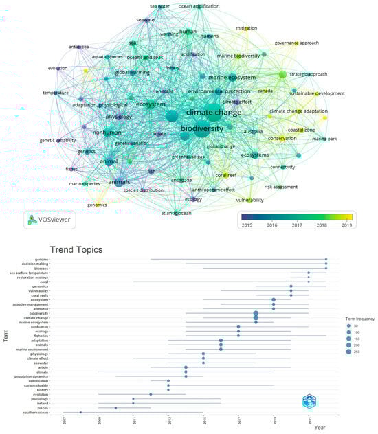 Chaudhary et al. [37], one of the most cited scholars in the field of climate change and marine biodiversity, cite global warming as a key driver of climate change, which poses a challenge to marine biodiversity. The increase in sea surface temperatures, a topic that has been extensively researched in the field of climate change and marine biodiversity (Figure 5), is believed to be responsible for latitudinal shifts in marine species. This study found that, as temperatures rise, there has been a decline in species and species richness along the equator, with species moving towards the poles in search of more suitable habitats. These findings are supported by other scholars, such as Lin et al. [38], who studied marine fish at various taxonomic levels and observed decreased species diversity at the equator, with the Northern Hemisphere having greater species diversity. In another study, Lin et al. [39] found that the number of fish species with higher taxon and phylogenetic similarity decreases with latitude and ocean depth because of climate change. Lin and Costello [40] also found that fish body size and trophic level increase with latitude because of climate change, likely because of changes in temperature and oxygen levels. On the other hand, Manes et al. [41] noted that the projected increase in temperature could lead to the extinction of endemic marine and island species. These changes concern ecologists and the general population that relies on fish species, as they can limit access to critical protein sources, particularly in developing countries.