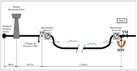 From the Randaccio pumping station, the treated water is conveyed to the city of Trieste via a dual-pipe system managed by AcegasApsAmga SpA (Hera Group). This dual system ensures a continuous water supply and provides a backup in the event of a problem with one of the pipelines. In particular, there is a 900 mm diameter steel pipeline, almost a century old, that runs under the coastal road to Trieste. The Sistiana piezometric tower along this pipeline ensures constant pressure, facilitating efficient water delivery. Two needle valves have recently been installed on this pipeline to optimize the water supply system through automatic pressure adjustment. Successively, in response to the increased water demand in Trieste, an SP was built in 1970, designed by G. Pistilli, one of the most talented Italian SP designers of the second half of the twentieth century (Figure 3). It was constructed of layered steel, bituminous cast, and concrete, reinforced with two electro-welded meshes; the internal diameter, D, is equal to 1297 mm. The SP operates at about 7–8 bar pressure under typical functioning conditions. The overland section of the SP extends a total of 680 m, connecting the Randaccio pumping station to the Petrinia piezometric tower. In addition, the pipeline extends for a further 1687 m, connecting the Petrinia piezometric tower to the VP in-line valve near the quarry in Villaggio del Pescatore, a very small settlement. In the immediate vicinity of Villaggio del Pescatore, several connections are active: (i) a branch to the Villaggio del Pescatore District Metered Area (DMA) via a DN100 iron pipe, (ii) a DN100 HDPE service line supplying a hotel, and (iii) two DN350 and DN150 iron pipe branches. Downstream of VP, the pipeline submerges for 17,935 m and connects VP to the in-line valve VM at Molo 0 of Porto Franco Vecchio. Just upstream of the VM, the device used for generating the transients is installed, as discussed in the third subsection. The pipeline emerges briefly before joining the existing supply lines near Viale Miramare.