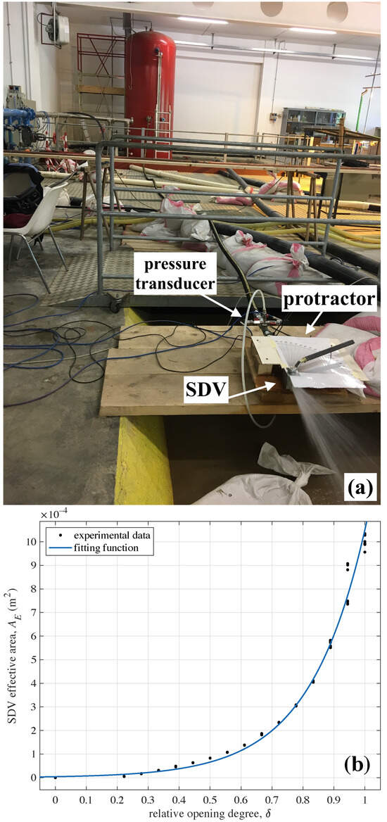 in which  (m2) is the valve effective area, Q (m3/s) is the discharge;  is the relative opening degree (with  = 1 (0) if the SDV is fully open (closed)),  (m) is the local head loss across the valve, and g is the acceleration due to gravity (9.806 m/s2). Experimental data are shown in Figure 4b, and, given their trend, the following fitting function was obtained: