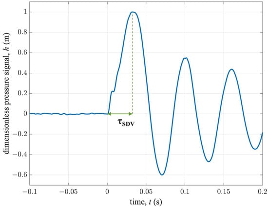 To accurately characterize the behavior of the SDV in unsteady-state conditions, transient tests were conducted by quickly closing the SDV. Figure 5 shows the dimensionless pressure signal, , acquired immediately upstream of the SDV, during a transient test. From such a pressure signal, the maneuver duration, , is assumed as the time interval between the instant when the pressure signal deviates from steady-state conditions (i.e., the transient starts) and the instant when the overpressure is fully accomplished. Specifically, it is equal to about 0.03 s, indicating that the maneuver is fast. It is worth noting that the SDV’s relative opening degree in such a test was equal to about 0.22. Values larger than this were not tested to avoid the generation of large overpressures in the laboratory setup. Instead, in the field tests, larger values of , and then of , are expected, since the SDV is to be connected to a large-diameter pipe and then not-too-large overpressures are a concern. Nevertheless, the small value of  obtained in the laboratory transient test in Figure 5 ensures that the maneuver performed with this valve in the SP will be sufficiently fast.