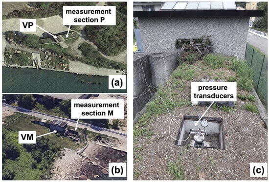 Characteristics of the measurement sections: (a) VP and measurement section P; (b) VM and measurement section M; (c) typical equipment for pressure measurement.