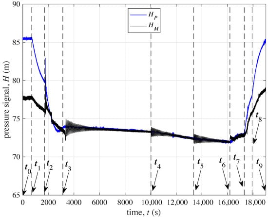 During step #5, performed at  = 13,360 s, which, as mentioned above, is relevant within TTBTs, a small initial pressure rise of 0.58 m in section M and 0.40 m in section P was observed, followed by the damping of pressure oscillations.