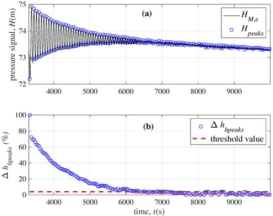 The time history of the resulting dimensionless peak variation is illustrated in Figure 9b. In this figure, a threshold is set where, if  falls below 4%—indicated by a red dashed line—it signals the readiness for initiating the subsequent step.