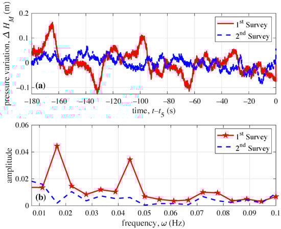 Pressure signals, H, in section M, acquired during the scheduled and extemporaneous surveys: (a) time-domain analysis and (b) frequency-domain analysis.