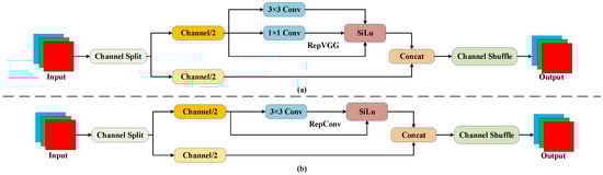 The figure above serves as an exposition of the RCS structure, divided into the training phase (Part a) and the inference phase (Part b). During training, the input undergoes channel separation, with one portion processed through the RepVGG block (without any branching structure, using only 3 × 3 convolutions, and employing ReLU as the sole activation function, as shown in Figure 3), while the other portion remains unchanged. Subsequently, the output of the RepVGG block and the unaltered input undergoes 1 × 1 and 3 × 3 convolutions, followed by channel shuffling and concatenation. In the inference phase, the initial multi-branch structure is streamlined into a singular 3 × 3 RepConv block (the main idea of RepConv is to use multi-branch convolution layers during training and then reparameterize the parameters of the branches onto the main branch during inference, thereby reducing computational cost and memory consumption, as illustrated in Figure 3). This design facilitates the acquisition of intricate features during training while minimizing computational complexity during inference.