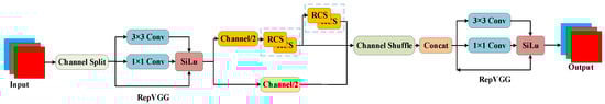 Within the RCS-OSA module (as shown in Figure 4), the input undergoes a partition into two segments: one segment experiences direct propagation, while the other undergoes processing through a stacked configuration of RCS modules. Post-processing, the features derived from the two segments are merged after channel shuffling. This design, integral to the RCS-YOLO architecture, plays a pivotal role in enhancing the model’s efficiency in feature extraction and utilization through the strategy of one-shot aggregation, all while maintaining computational efficiency. The primary objective is to elevate the network’s effectiveness in handling dense connections. The OSA module addresses this by representing diverse features with multiple receptive fields and aggregating all features only once in the final feature map, effectively overcoming the efficiency challenges associated with dense connections in DenseNet.