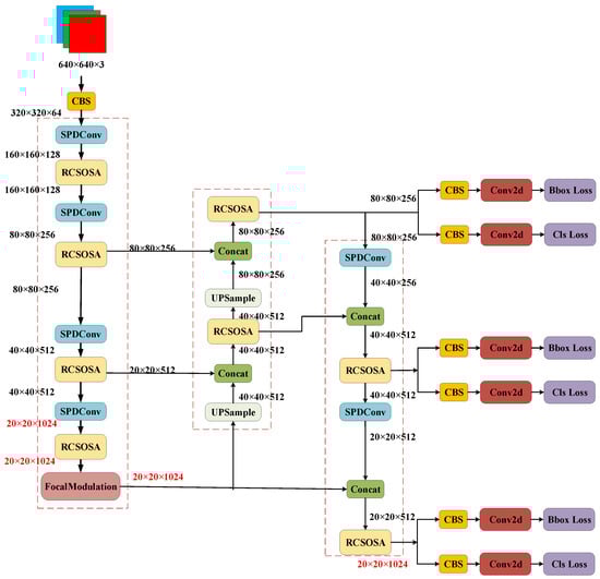 The portions with modifications are indicated by red boxes in the Figure 7. Firstly, all CBS (Cross-Stage Partial Network) modules in the network backbone, except for the input as the first CBS module, are replaced with SPDConv modules, and the C2f module in both the network backbone and feature pyramid is substituted with RCSOSA. In the last layer of the backbone, the SPPF structure is enhanced to the Focal Modulation module, resulting in the final modified YOLOv8-STD model.
