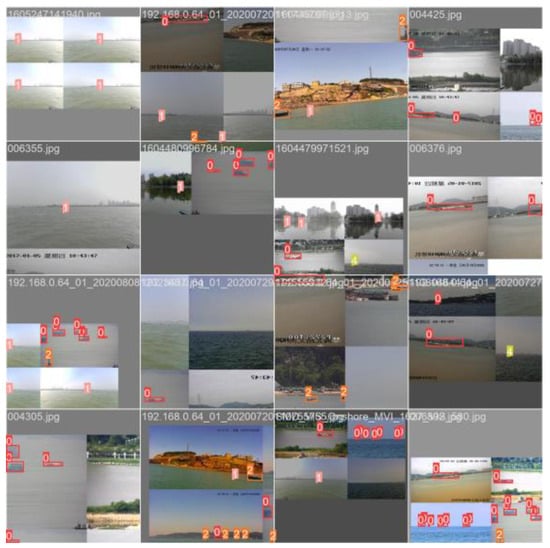 In order to enhance the generalization capability of the object detection model, it is common practice to apply data augmentation techniques before training neural networks. Commonly employed methods include scaling, translation, rotation, and color transformation. Given the intricate working environment of unmanned vessels, this study incorporates scaling, translation, color variation, and the mosaic data augmentation technique [20] to introduce diversity to the dataset. To avoid potential decreases in recognition accuracy resulting from symmetrical relationships among digits, this study abstains from utilizing flip-based data augmentation. The mosaic data augmentation method involves the random cropping and scaling of four images within the dataset, followed by a random arrangement and concatenation to create a single image. In cases where small images or blank areas are present, they are complemented with gray color to ensure consistency with the original input size. The visual representation of this effect is presented in Figure 8.