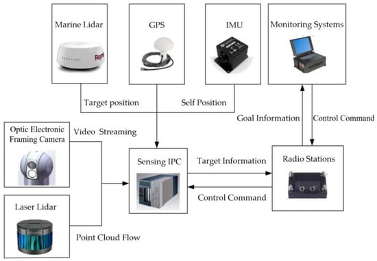 The USV platform features a 7.5 m workboat with protective fenders floating externally(as shown in Figure 15), ensuring excellent navigability and safety. The use of a deep-V hull design meets strict requirements for key performance factors such as speed, stability (steady maneuvering), navigability, and safety. The seamless integration of hardware components serves as a fundamental assurance for the smooth validation of the unmanned platform. Based on the existing spatial structure of the unmanned platform and requirements for remote control devices, autonomous equipment, power supply for mission payloads, and connectivity, the spatial layout planning of hardware devices and circuit connections for the unmanned platform was completed. Equipped with optical, radar, sonar, and other devices, the platform possesses autonomous driving capabilities, as shown in Figure 16.