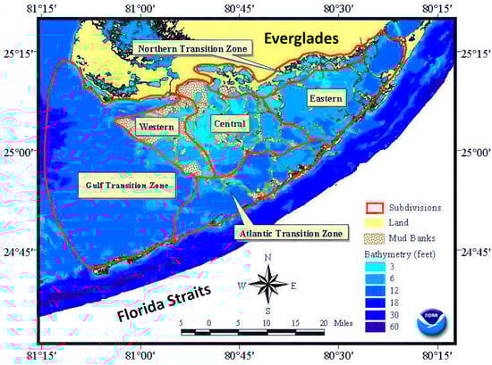 Florida Bay is a triangular estuary, bordered to the north and east by the southern mainland of the Florida peninsula and to the south by the Florida Keys and opening into the Gulf of Mexico on the west (Figure 1). The bay is large and shallow, covering around 2200 square kilometers (km), with depths averaging less than one meter (m) [7]. About 80% of the estuary falls within the Everglades National Park (ENP), and much of the remaining portion lies within the Florida Keys National Marine Sanctuary. Florida Bay holds economic importance as a tourist, commercial fishing, and recreational area. Shallow and often hyper-saline, the bay was, until recently, known for clear waters and lush seagrass meadows covering a mosaic of shallow water banks and numerous relatively deeper water basins. It provides essential habitat for numerous marine species with environmental, commercial, and recreational importance.