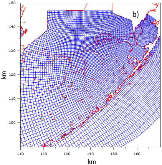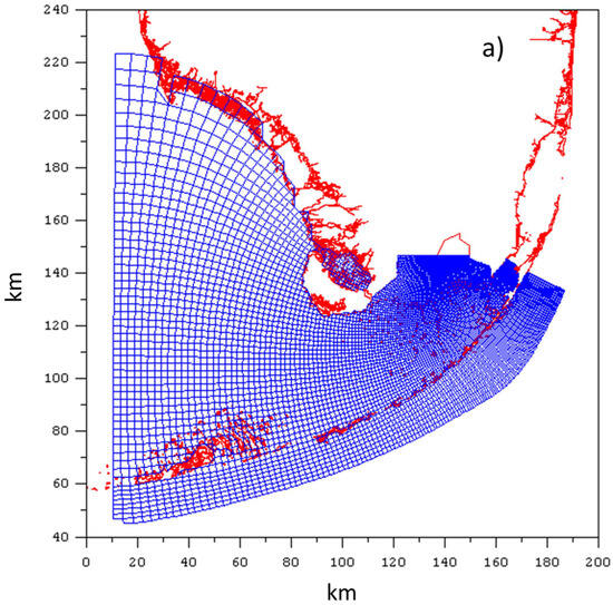 Grid resolution is a crucial aspect in the development of hydrodynamic and water quality models, with various studies emphasizing the selection of optimum resolutions in both the horizontal and the vertical directions. For instance, Andrejev et al. [37] discussed the role of spatial resolution in a three-dimensional hydrodynamic model for marine transport risk assessment. Hasan et al. [38] found that increasing grid resolution improved the agreement of computed flow velocities with field observations in the Johor Estuary, Singapore. They highlighted that enhancing the alignment of the grid with channel boundaries, with a more modest increase in resolution, significantly improved model performance. This grid modification notably impacted computed salinity in the estuary, while water levels were only slightly affected. Ralston et al. [39] assessed a 3D unstructured grid finite-volume hydrodynamic model against shipboard and moored observations, reporting that a coarse grid led to increased numerical mixing, necessitating further reductions in turbulent mixing and greater bed friction for optimization. Nwogwu et al. [40] used the EFDC model to simulate water surface elevation, comparing results with three grid resolutions—fine, medium, and original—and found similar performance for each.