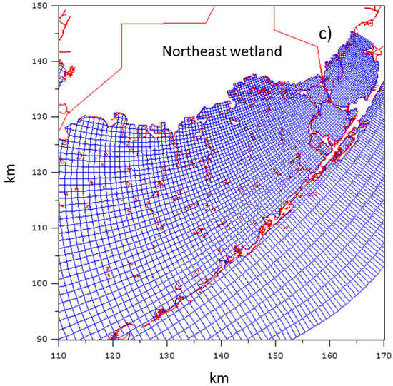 (a): model grid with northeast wetland; (b): blow-up of model grid with the northeast wetland; (c): blow-up of model grid truncated at nominal coastline in the northeast region.