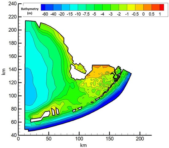 Florida Bay is a complex combination of shallow bays, keys, bars, cuts, and narrows. The interior region of Florida Bay is characterized by shallow open-water sub-basins separated by narrow shoals or ridges and large, extremely shallow regions that may become exposed during periods of low sea level. Its bathymetry and topography data are based on the United States Geological Survey (USGS) bathymetric and topographic surveys of Florida Bay and the adjacent wetlands of the ENP and the southwest Florida coast, the National Oceanic and Atmospheric Administration (NOAA) Coastal Relief bathymetry, and NOAA soundings [28,29]. In areas with no observed data, primarily corresponding to banks in the bay, thematic mapping-based elevation data were also incorporated into the data model. In regions with unknown or poorly known bathymetry, the bottom elevations are set to 0.3 m. This default bottom elevation of banks and shoals is primarily based on the reported inability of USGS survey vessels to take bathymetric measurements in regions with water depths less than approximately 0.3 m [24]. Figure 3 presents the bathymetry and topography interpolated to the model grid.