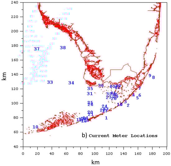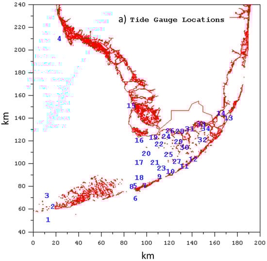where ζLF is the low-frequency water surface elevation, M is the number of tidal constituents, ζRCm and ζRSm are cosine and sine amplitudes at frequency ωm, and t is time. Five harmonic constituents (M2, S2, N2, K1, and O1) were used. The locations of 34 tidal gauge stations are shown in Figure 4a. Tidal gauge information is sparse along the open boundary, requiring the estimation of tidal frequency components of the incoming wave open boundary condition through an inverse procedure described by Tetra Tech [23].