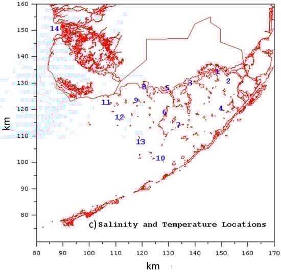 Fresh and brackish water inflow along the boundaries of the model domain is provided by the USGS TIME model [30]. The TIME model provides an estimate of net freshwater inflow at 12 locations along the nominal coastline of Florida Bay. For model simulations using the nominal coastline version of the grid (as shown in Figure 2c), the 12 freshwater inflows were used and assigned zero inflowing salinity. For model simulations using the northeast wetland version of the grid (as shown in Figure 2a,b), brackish inflows were assigned to the model cells, which were assigned upwind salinities from the TIME simulation.