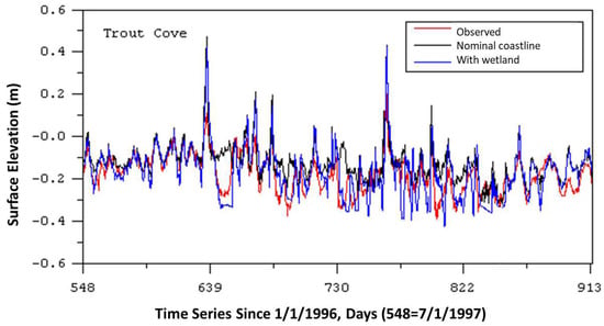Low-frequency water surface elevation is obtained by removing the tides. The variability of low-frequency sea level is the crucial factor influencing water surface elevation within the interior of Florida Bay. As an example, Figure 6 presents a comparison between observed and modeled low frequency sea levels at Trout Cove over 365 days, from Day 548 (1 July 1997) to Day 913 (1 July 1998). Trout Cove corresponds to Location 33 in Figure 4a. The figure reveals that both grid configurations, the nominal coastline version and the northeast wetland version, effectively capture observed sea level variations. Notably, the grid with the wetland performs better in representing rapid sea level drops after high-sea-level events at Trout Cove (for example, just after Day 639 and Day 730). This can be attributed to the fact that the inclusion of the wetland along the northern boundary allows a north–south seiche response. Table 2 provides a summary of the time series error analysis for two stations: Trout Cove and Terrapin Bay (Station 28 in Figure 4a). Root mean square errors (RMS) at Trout Cove are less than 9 cm, and when normalized by an absolute range of 60 cm, absolute relative errors are less than 9%.