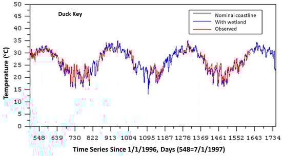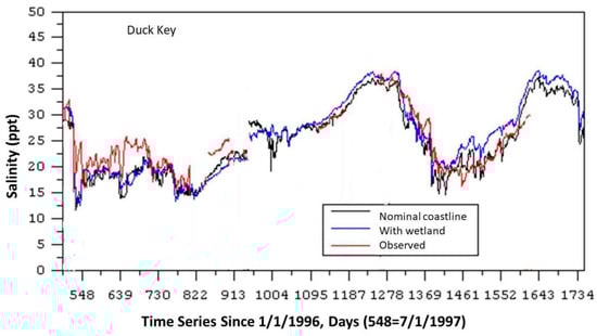As an example, Figure 8 shows a comparison of observations and modeled salinity at Duck Key using the nominal coastline and the northeast wetland configurations. Lower-salinity conditions are associated with episodic events such as tropical storms or above-average rainfall. Through visual and quantitative assessment (refer to Table 5), both the nominal coastline and the wetland configurations perform well in calculating salinity. Overall, the nominal coastline configuration, which introduces net freshwater inflows at points along the nominal coastline, yields superior error measures. A refinement of the wetland’s configuration incorporating groundwater interaction could likely enhance the accuracy of the wetland configuration.