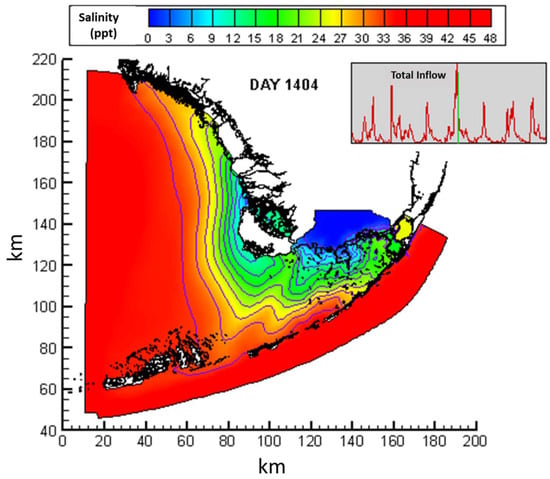Figure 9 presents the modeled salinity on Day 1404 (5 November 1999). The insert in Figure 9 shows the patterns of total freshwater inflow during the seven years of the simulation period (1996–2002). The green line indicates that Day 1404 has a relatively high inflow. Salinity variability in Figure 9 is most pronounced in the northeast, diminishing toward the west. This pattern reflects the dynamic interplay of the freshwater inflow, the continuous exchange of water with the coastal ocean and the Gulf of Mexico, variation in evaporation, and physical circulation effects. Freshwater inflow from the Everglades dilutes the salinity in the northeast of the bay, while exchange with the Florida Straits and the Gulf of Mexico replaces diluted estuarine water with water of higher salinity and greater density. Thus, the changes in salinity, both temporally and spatially, are driven by three key processes: the net supply of freshwater, the mechanisms governing mixing within the estuary (such as wind, topography, and currents), and the exchange of salinity with the coastal ocean.