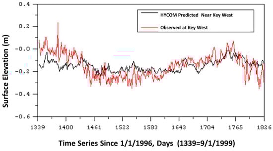 Figure 10 represents a comparison of low-frequency water surface elevations at Key West (the western boundary of the FBM) between HYCOM simulated results and the observed data. The figure indicates that HYCOM simulated some general features of the observations but exhibited less variability and extended periods of underestimation and overestimation. A notable concern is the mismatch in the first 90 days and the absence of the observed extreme high sea level around Day 1380 that coincided with the time of the largest freshwater inflow to the bay.