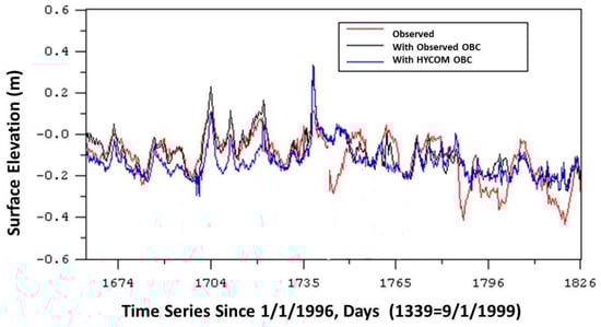 The FBM described in Section 2 utilized measured data to specify the OBC, which is a preferred approach. In the absence of measured data, another common approach is to employ results from another ocean model with a larger domain. The HYbrid Coordinate Ocean Model (HYCOM) has been applied to the Gulf of Mexico for many years (e.g., [35,36]). To understand the ability of the FBM to accept low-frequency hydrodynamic OBCs from HYCOM, a 16-month simulation, from September 1999 to December 2000, was conducted with the nominal coastline version of the grid. All forcing functions remained the same, except that the low-frequency components of OBCs were replaced by results from the HYCOM simulation, including water surface elevation and barotropic current.